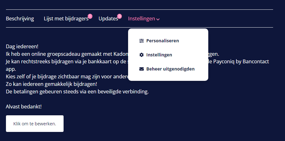 De organisator van het groepscadeau kan nog wijzigingen aanbrengen na het aanmaken van het groepscadeau.