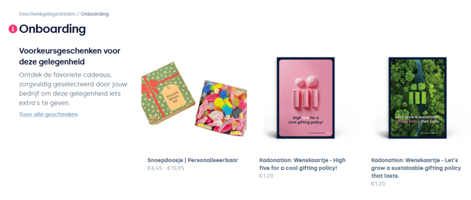 Voorkeursgeschenken kan je kiezen per gelegenheid. Als je een geschenk een sterretje geeft, verschijnt het bij die specifieke gelegenheid bovenaan het geschenkoverzicht. Dit zijn bijvoorbeeld onze voorkeursgeschenken voor de categorie 'onboarding'.